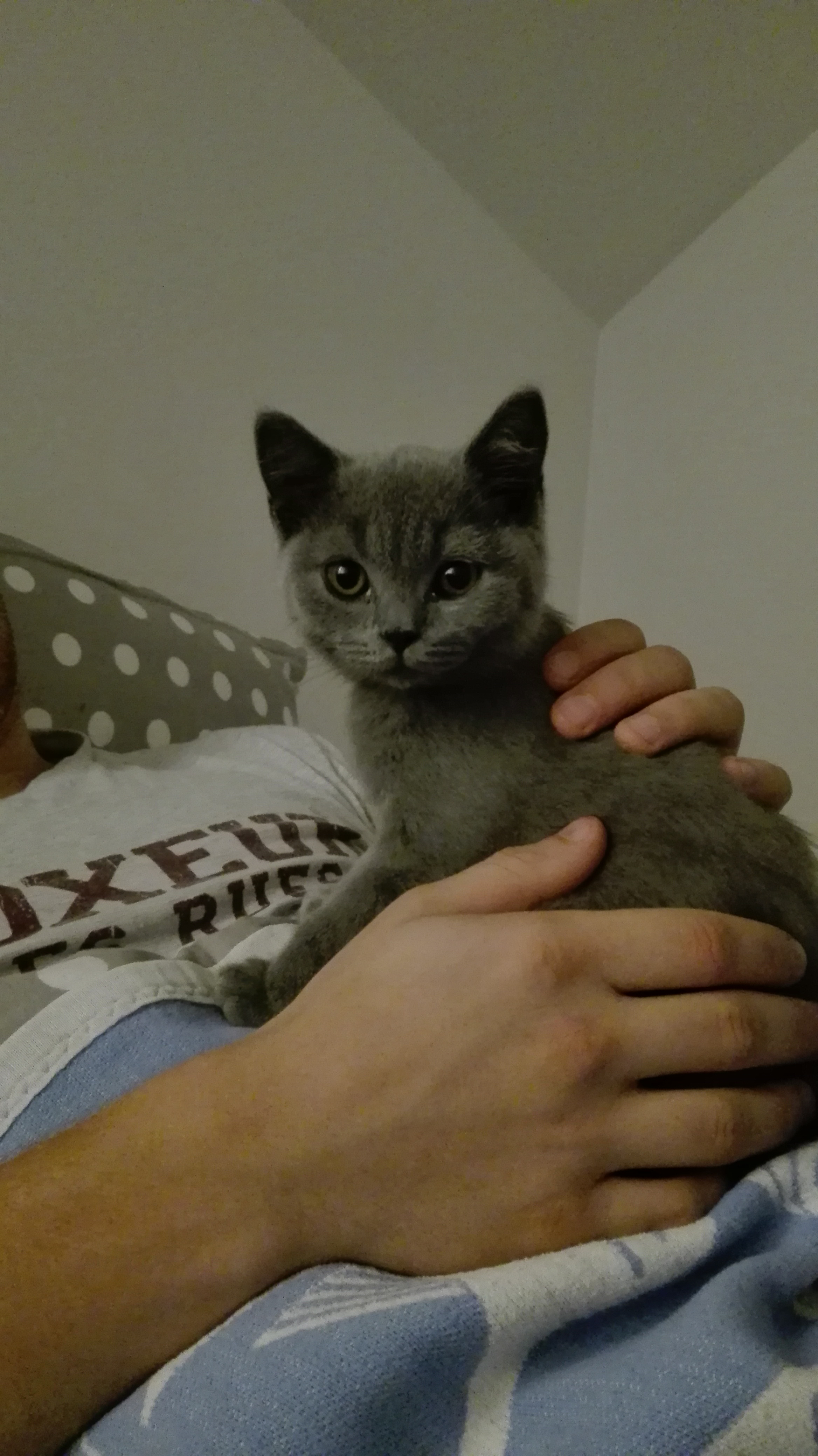 Stałe miejsce nadal pod łóżkiem na tym biało-niebieskim kocyku w koty, czasami wychodzi, je mięsko, daje się posmyrkać pod brodą i po brzuszku i odchodzi pod łóżko, więc jest duży postęp. Płacz za mamusią nadal wielki ale o 50% mniej niż w nocy.